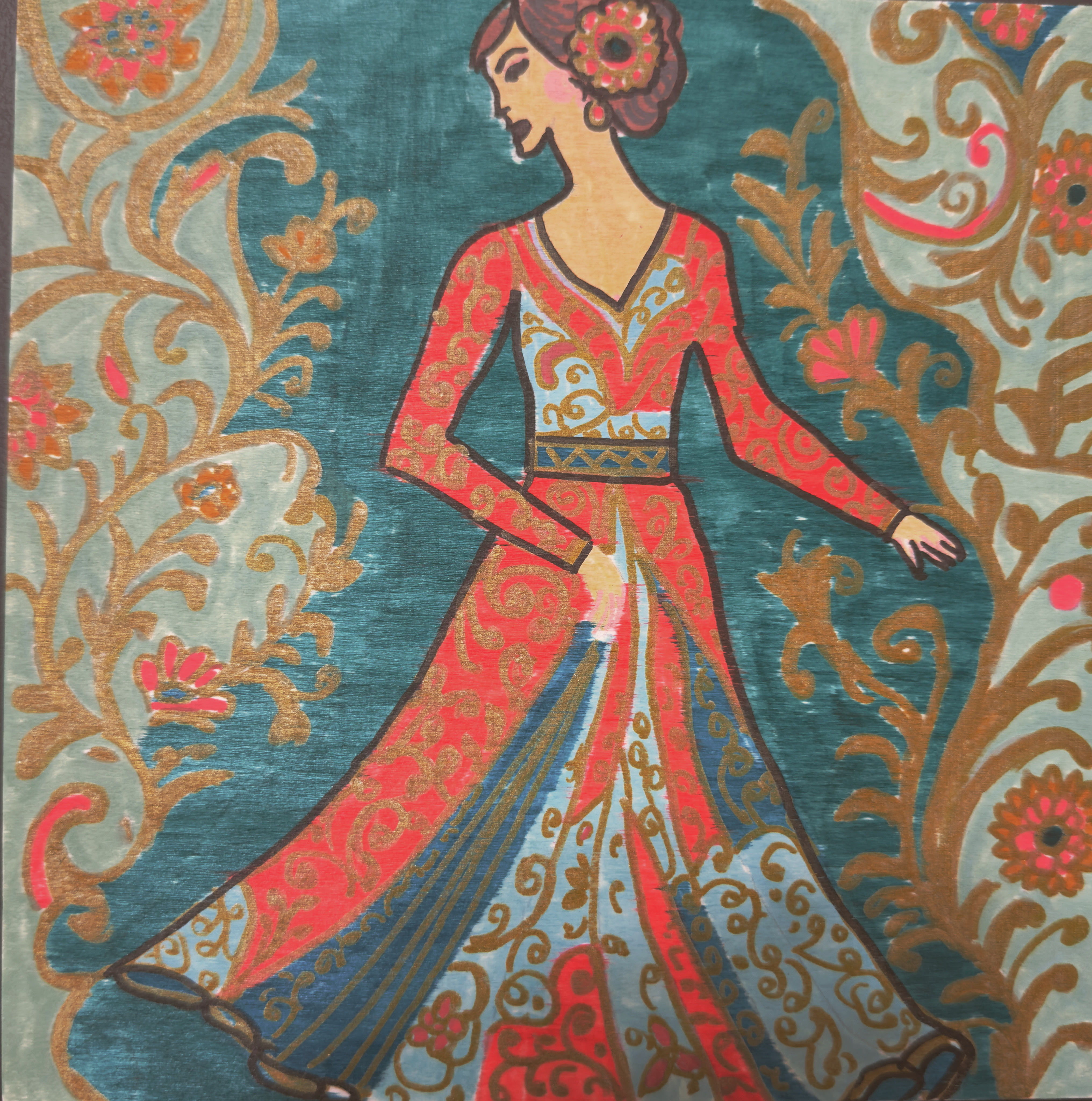 Flowers, leaves and stems, she skillfully embroidered