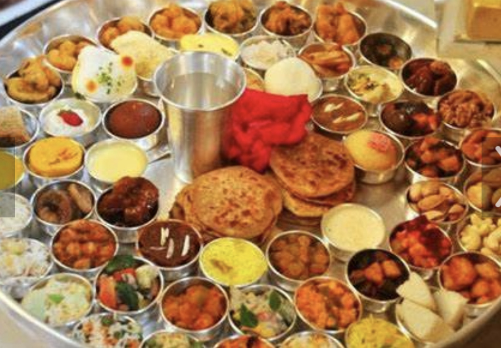 (Image shows “Chhappan Bhog” or 56 dishes presented to Lord Krishna, a Hindu deity)